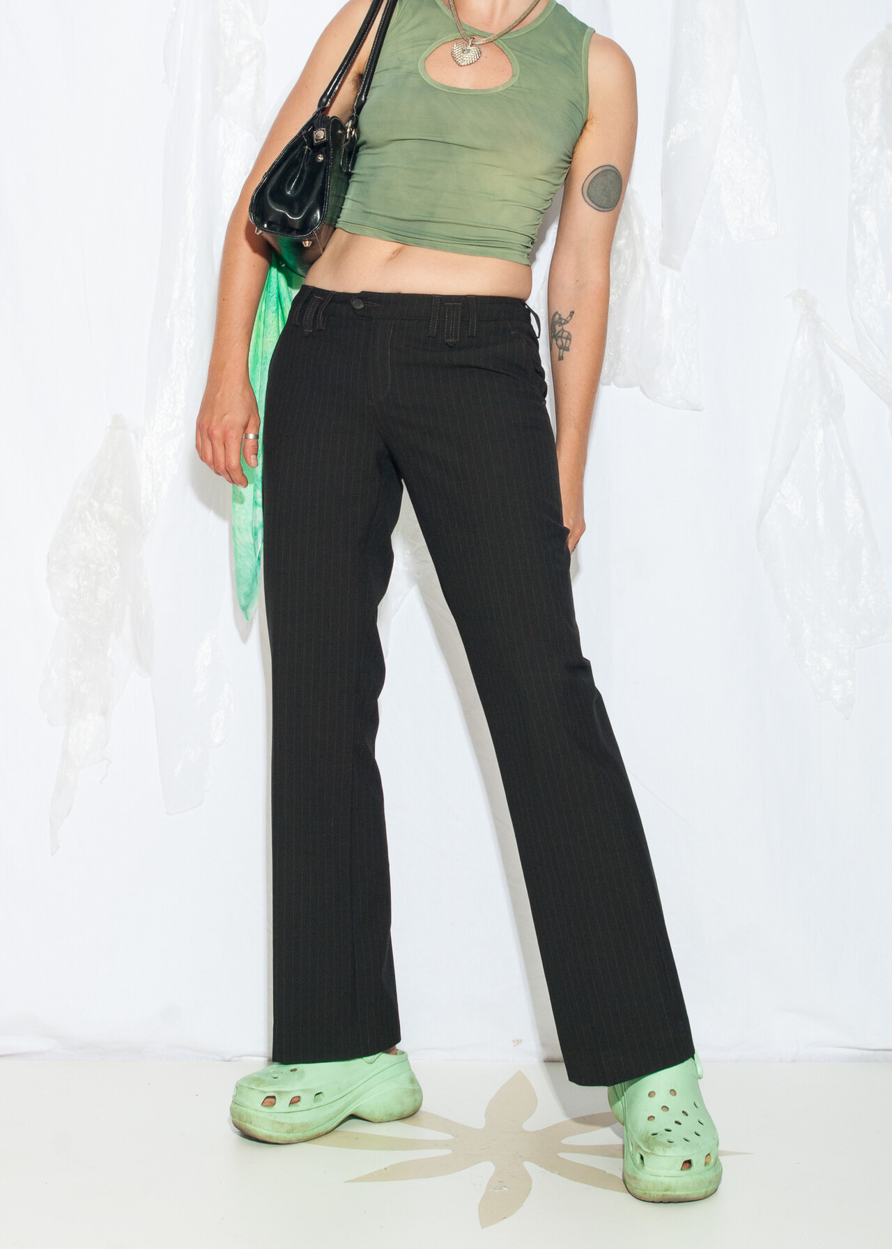 Tags: 2000s style clothing, business suit pants, flare trousers, low rise waist, office siren, pinstriped pants, wool blend bottoms, y2k vintage fashion