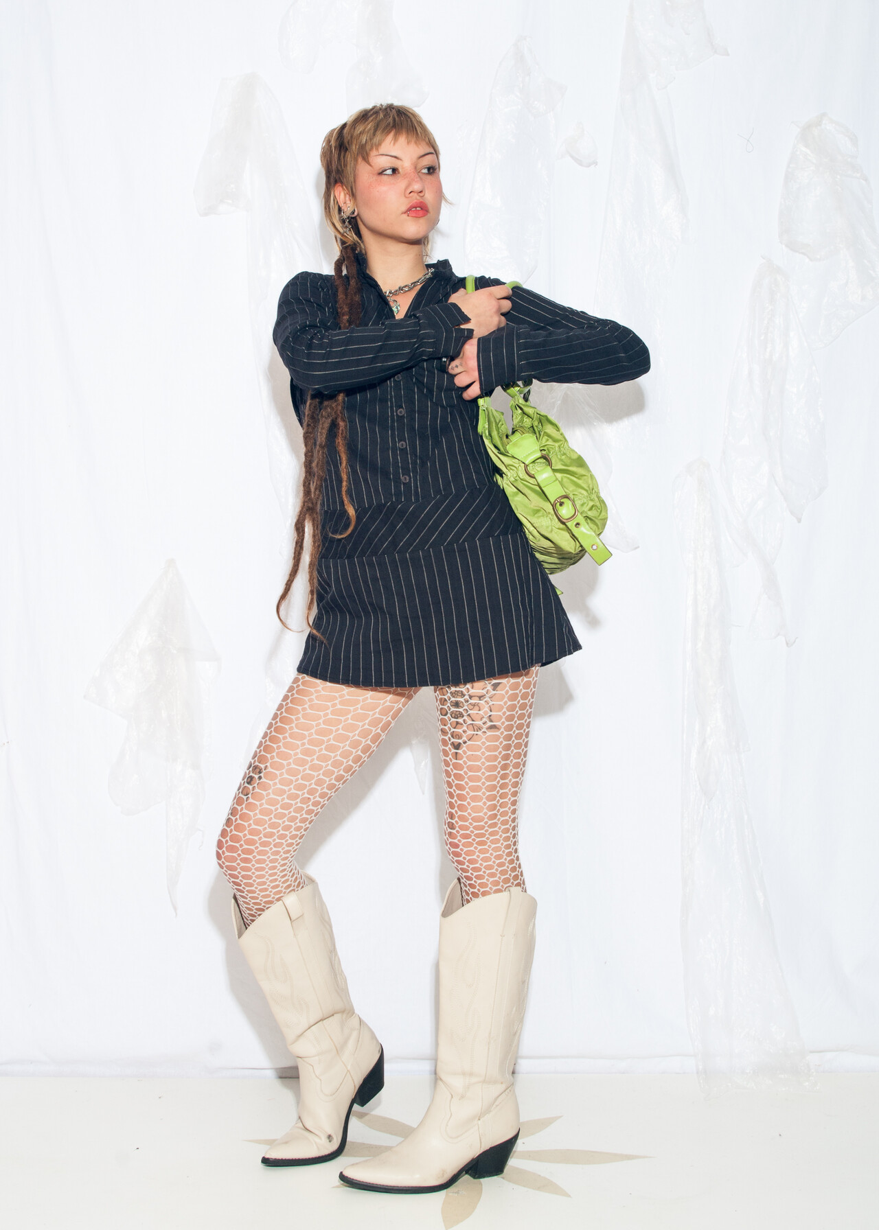 Tags: 2000s style clothing, micro skirt, office siren, pinstriped dress, y2k vintage fashion
