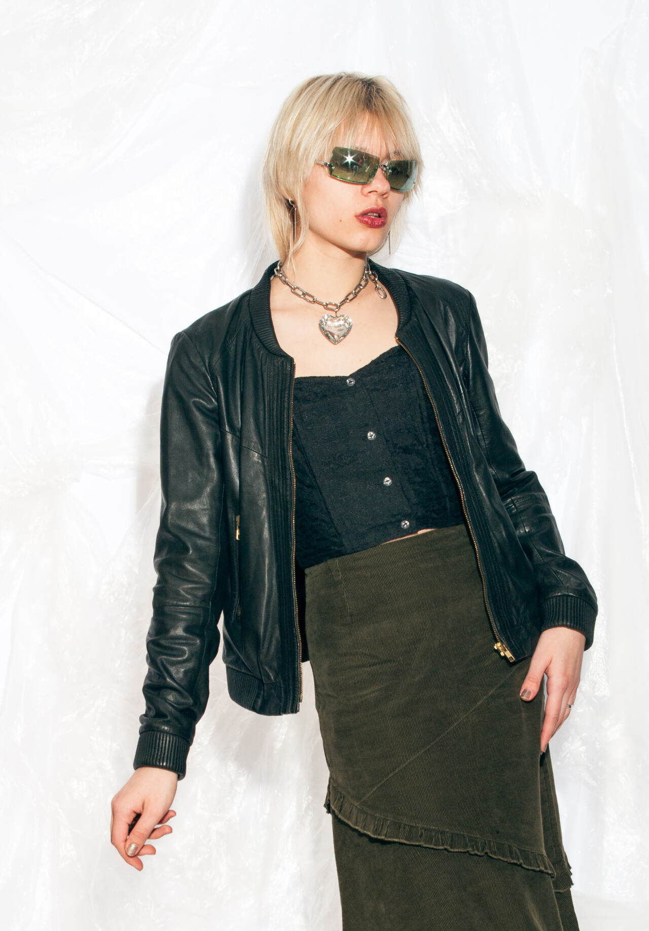 This racing-style Y2K vintage jacket is the coolest time capsule. Get ready to zip through a fashion throwback to the noughties in sleek leather and edgy black. A jacket fit for an outrageous ride!