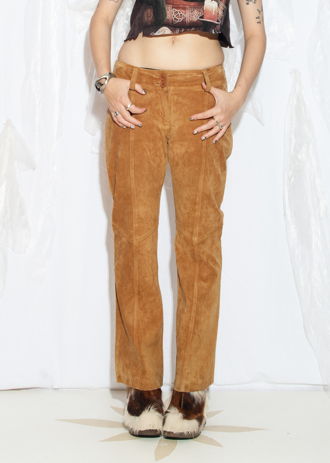 These Y2K vintage trousers are like stepping into a time machine full of low-waist, earthy brown, real leather suede goodness!