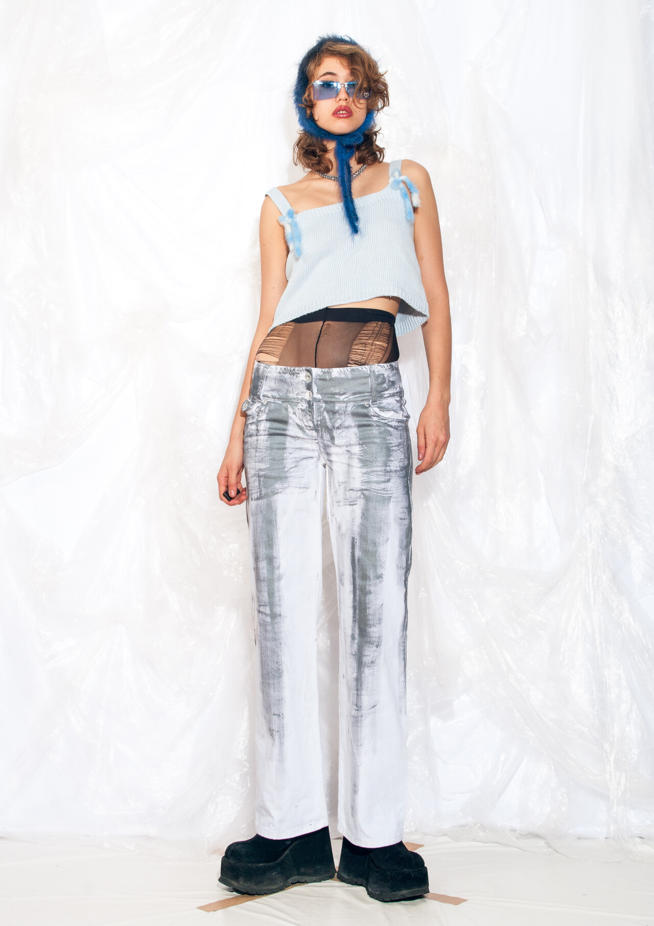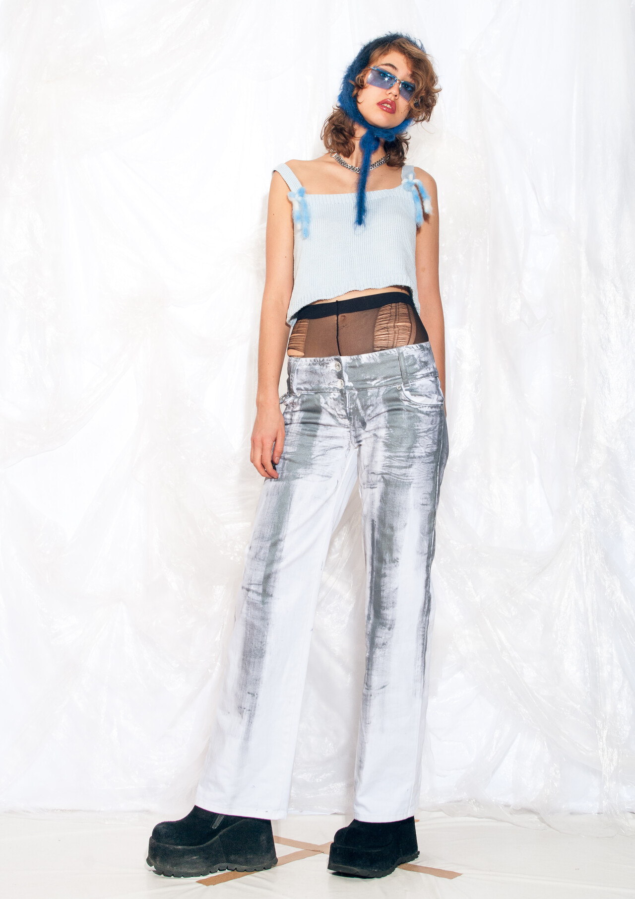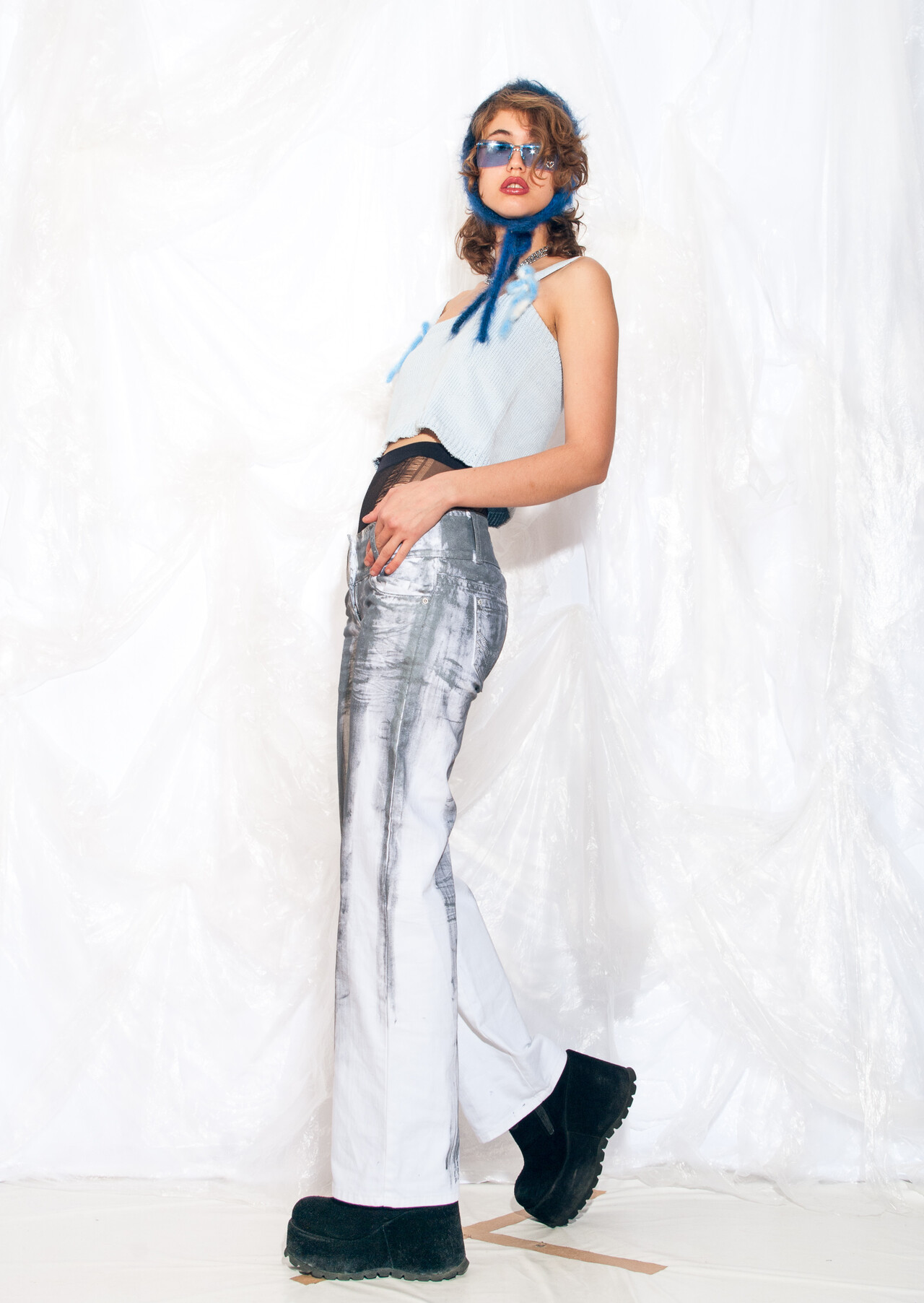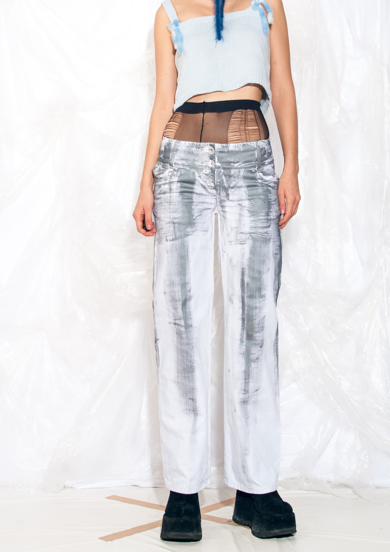 Vintage jeans 90s reworked clear PVC panel crop denim pants