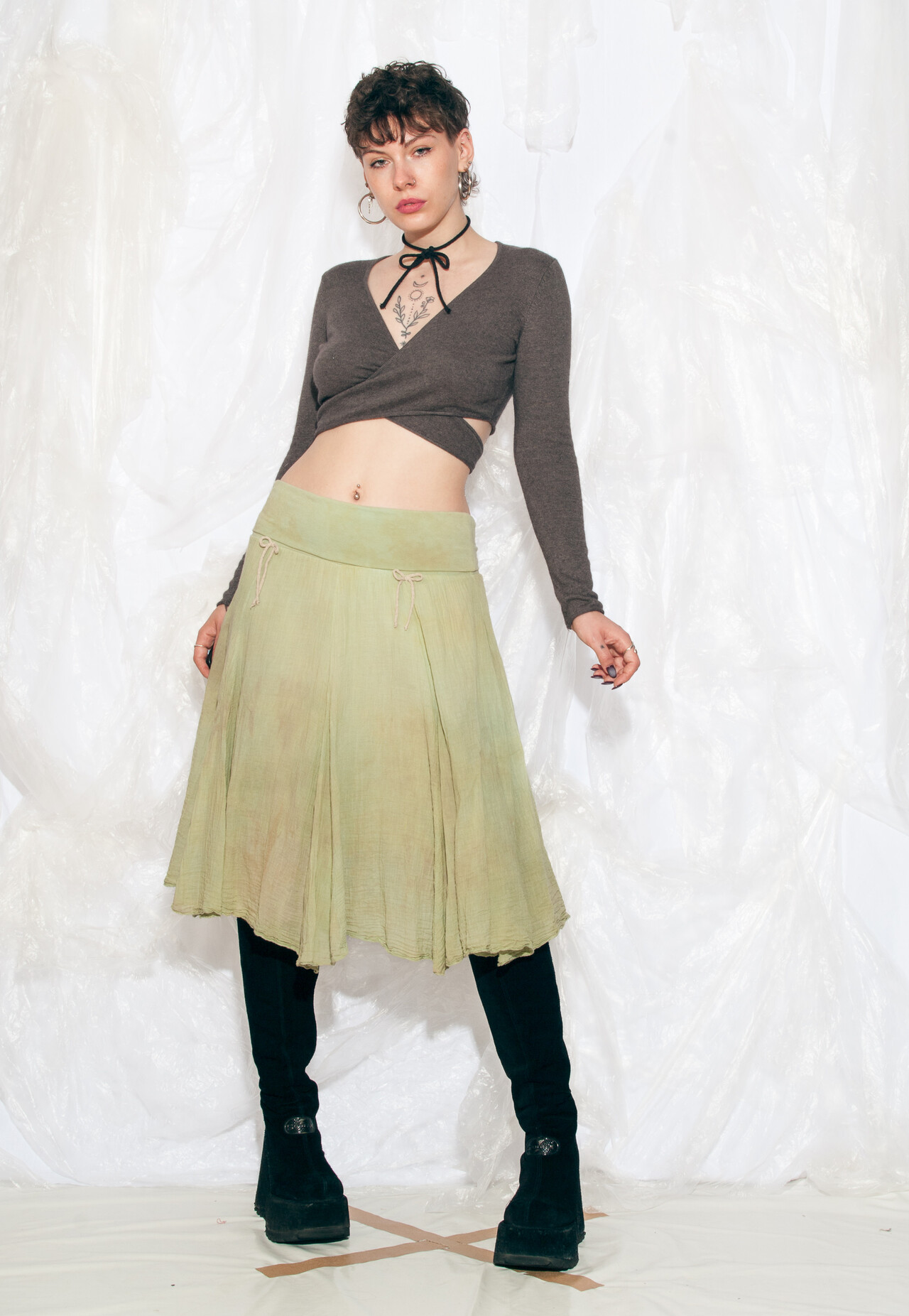 Reworked Y2K vintage midi skirt in overdyed green. We even added little bows to the waist.