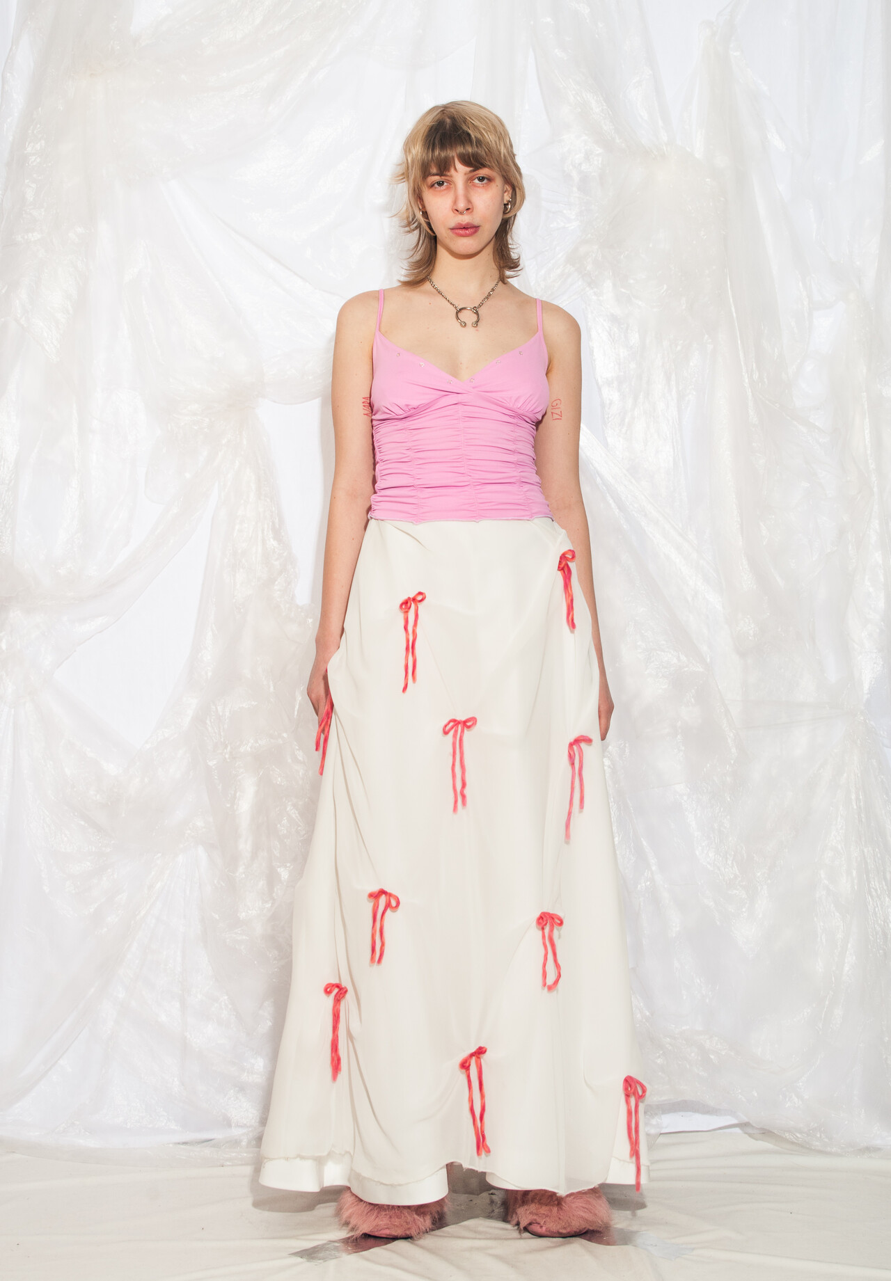 This Y2K vintage wedding maxi skirt is full-on nostalgia with a twist – literally! Reworked with bows added by us, this white maxi skirt is ready to take you back to the early internet age while keeping your style fresh and fun.