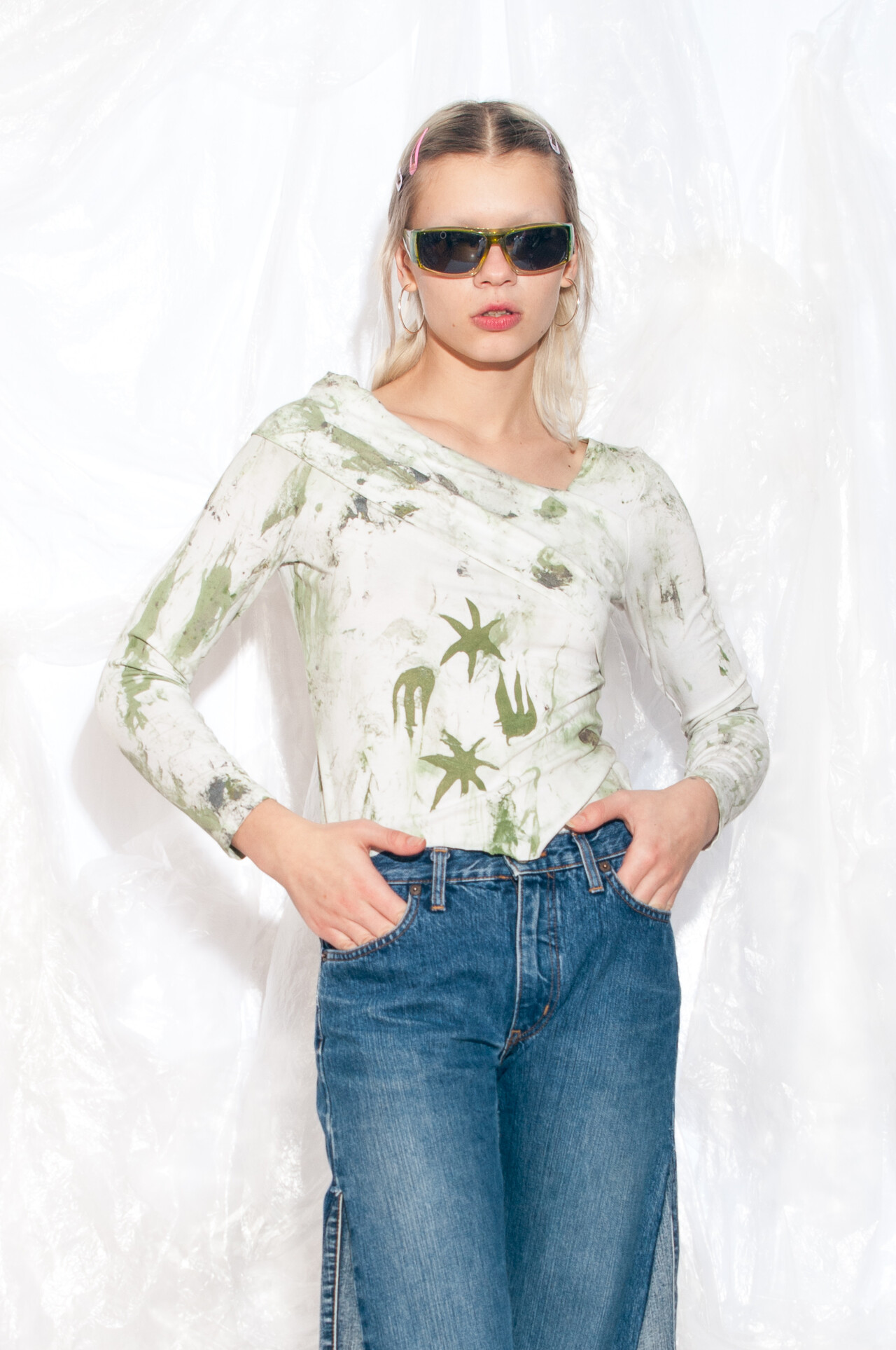 Vintage Y2K Reworked Seaweed Top in Moss Green Hand Painted