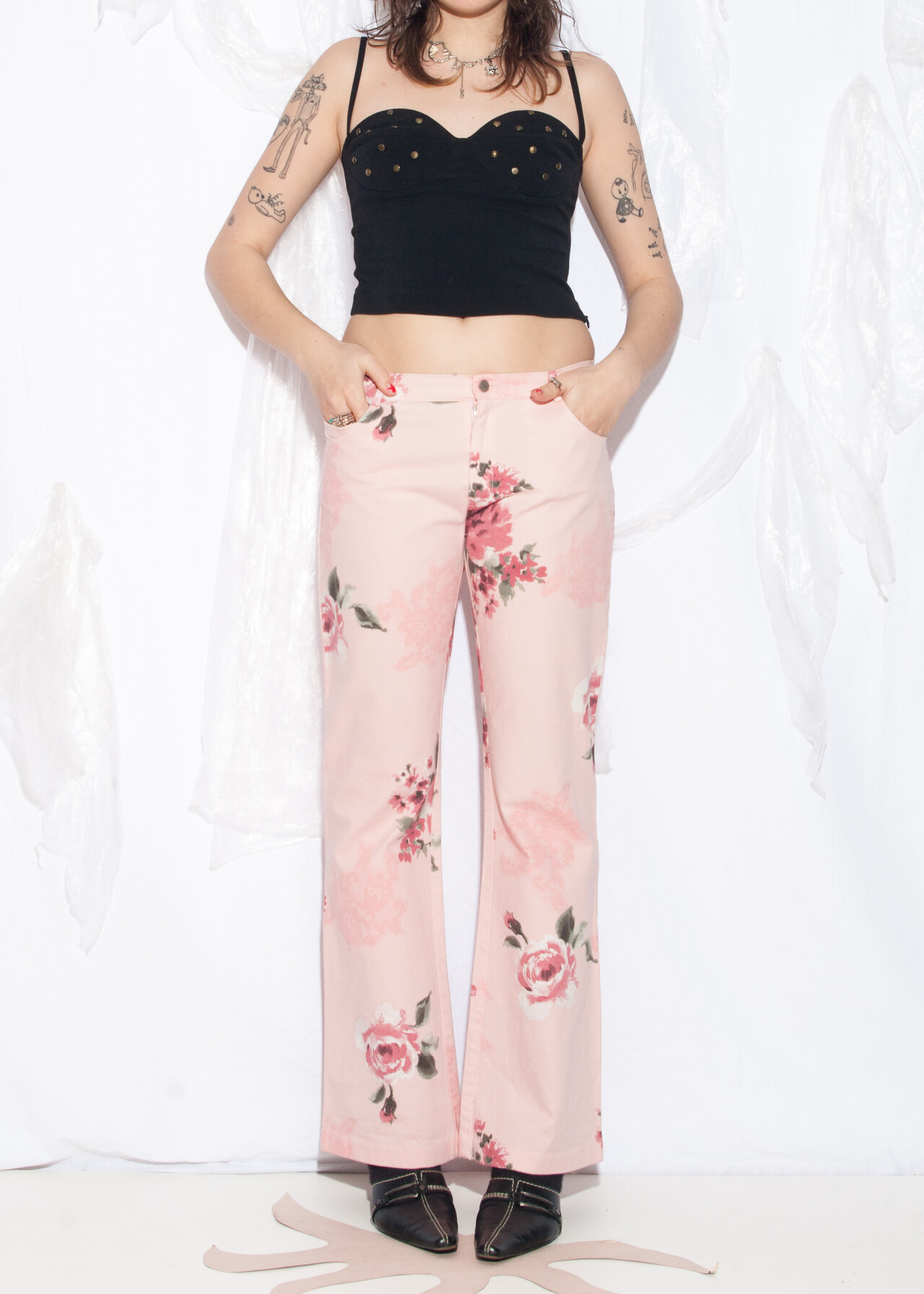 These Y2K vintage flare trousers by Sandro Ferrone are like strutting through a rose-patterned time warp with a low-rise waist that says “hello” to the early 2000s.