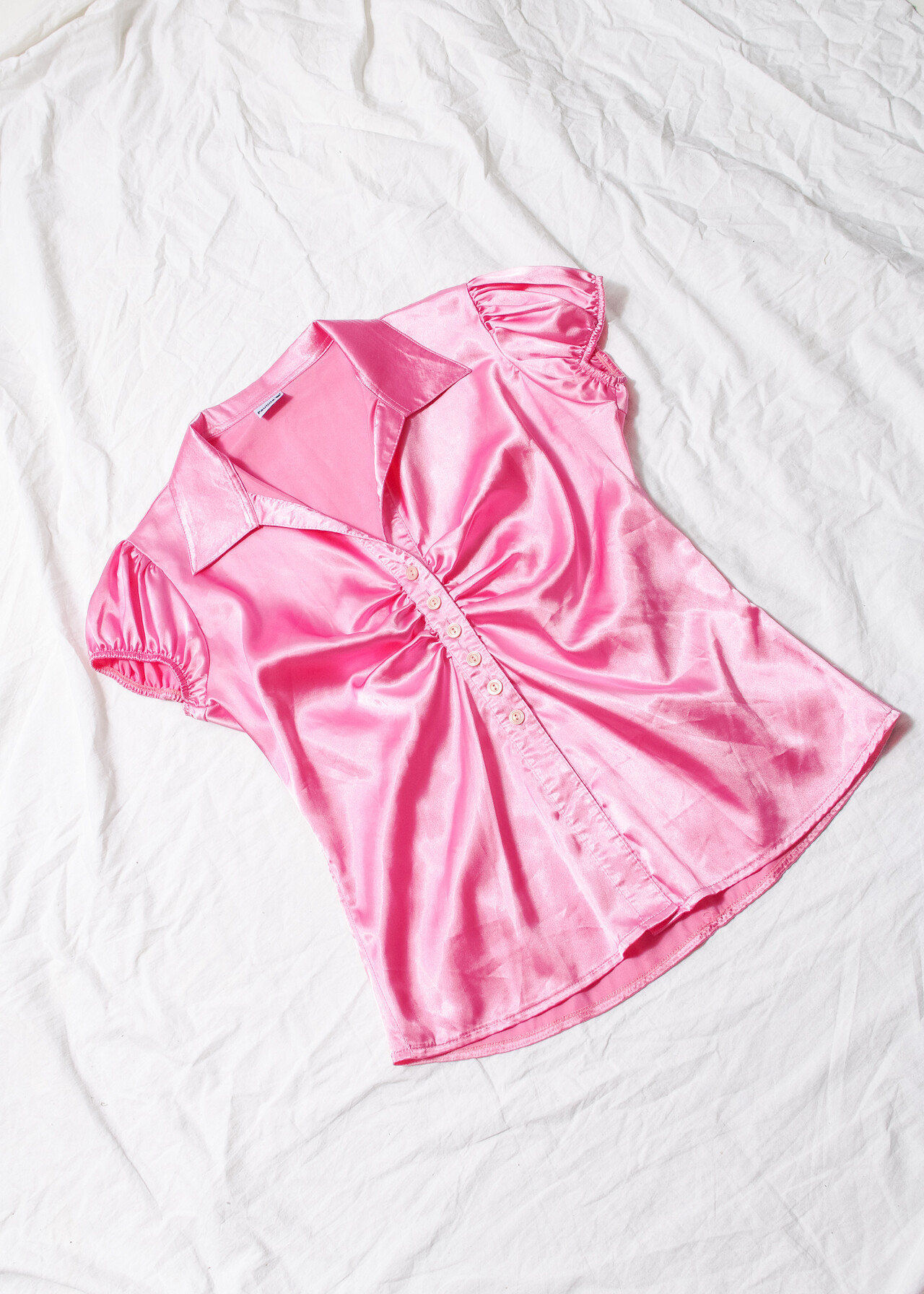 Tags: 2000s style clothing, Barbiecore, fitted shirt, office siren, pastel aesthetic, pink satin top, pinterest outfit, ruched detail, slim fit blouse, y2k vintage fashion