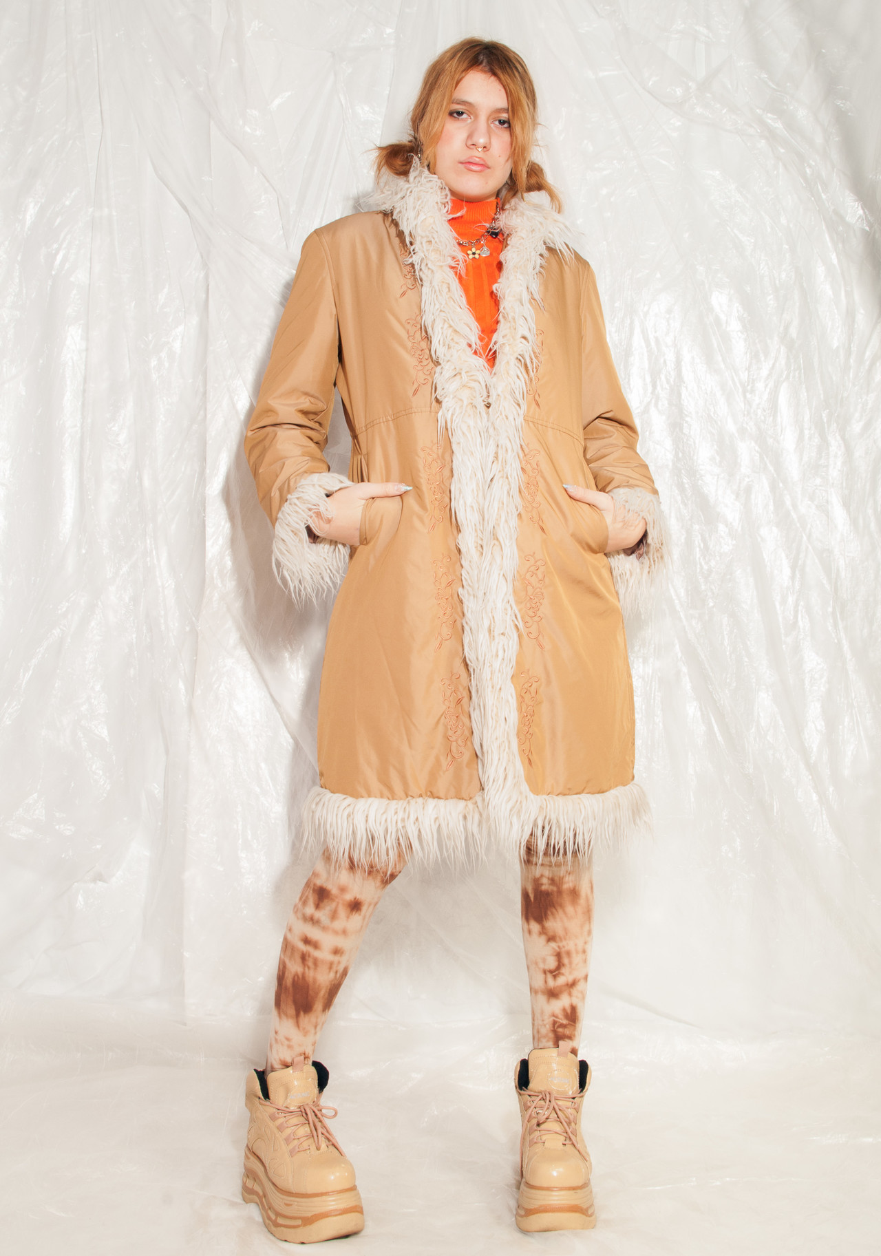 Y2K vintage afghan coat with shaggy faux fur trims, our latest find still in flawless condition. Featuring beige mixed fabric, embroidered details, two pockets and a hook & eye closure. It’s fully lined. Save the planet, switch to vintage now!
