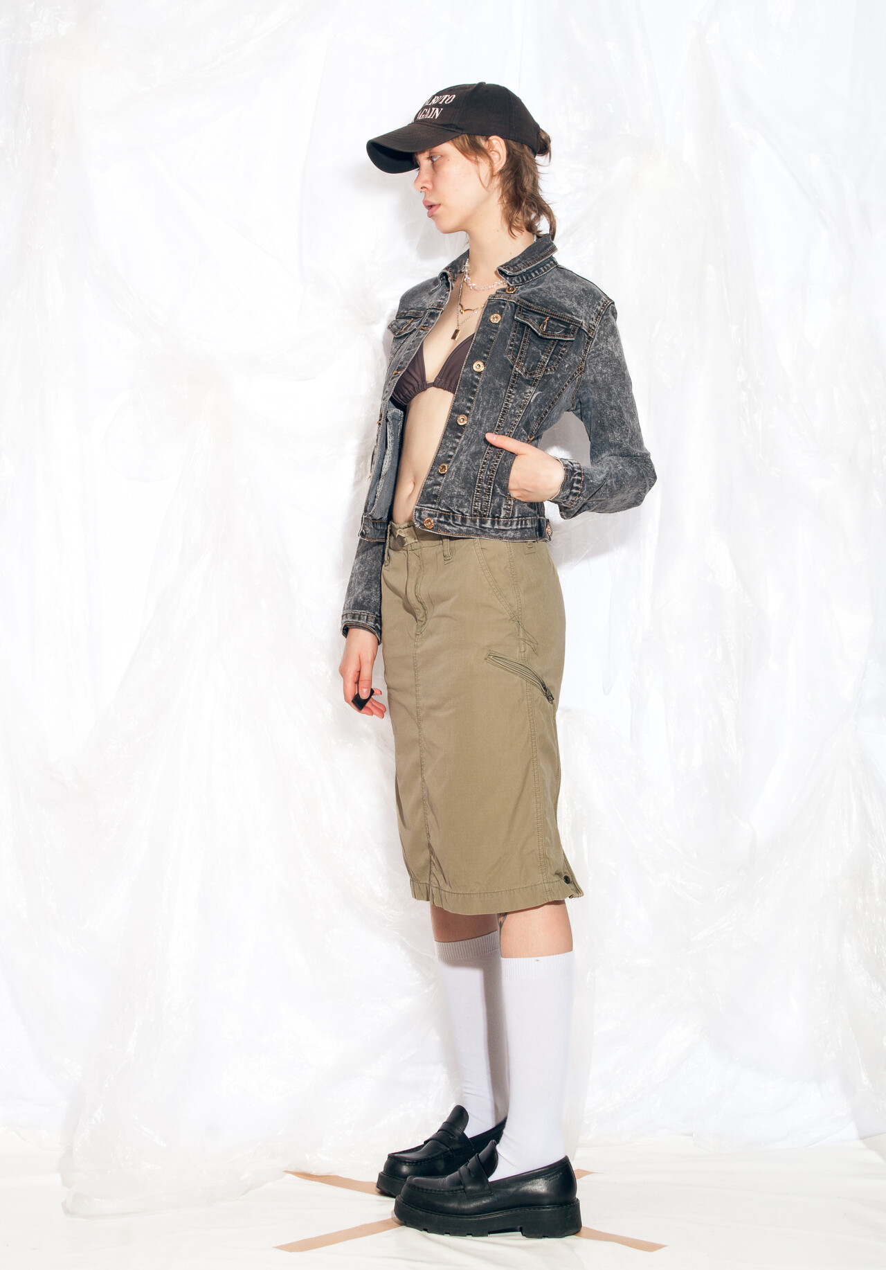 A rad acid-washed denim jacket from the 2000s. It’s a real vintage piece that survived in great condition. We had to fix a hole in it but other than that it’s flawless. Made from a slightly stretchy fabric.