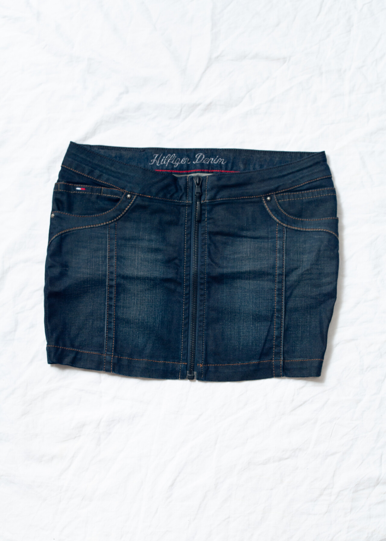 Tags: 2000s style clothing, dark wash denim, denim mini skirt, jean skirt, low waisted bottom, Tommy Hilfiger, y2k grunge outfit, y2k vintage fashion, zip front skirt