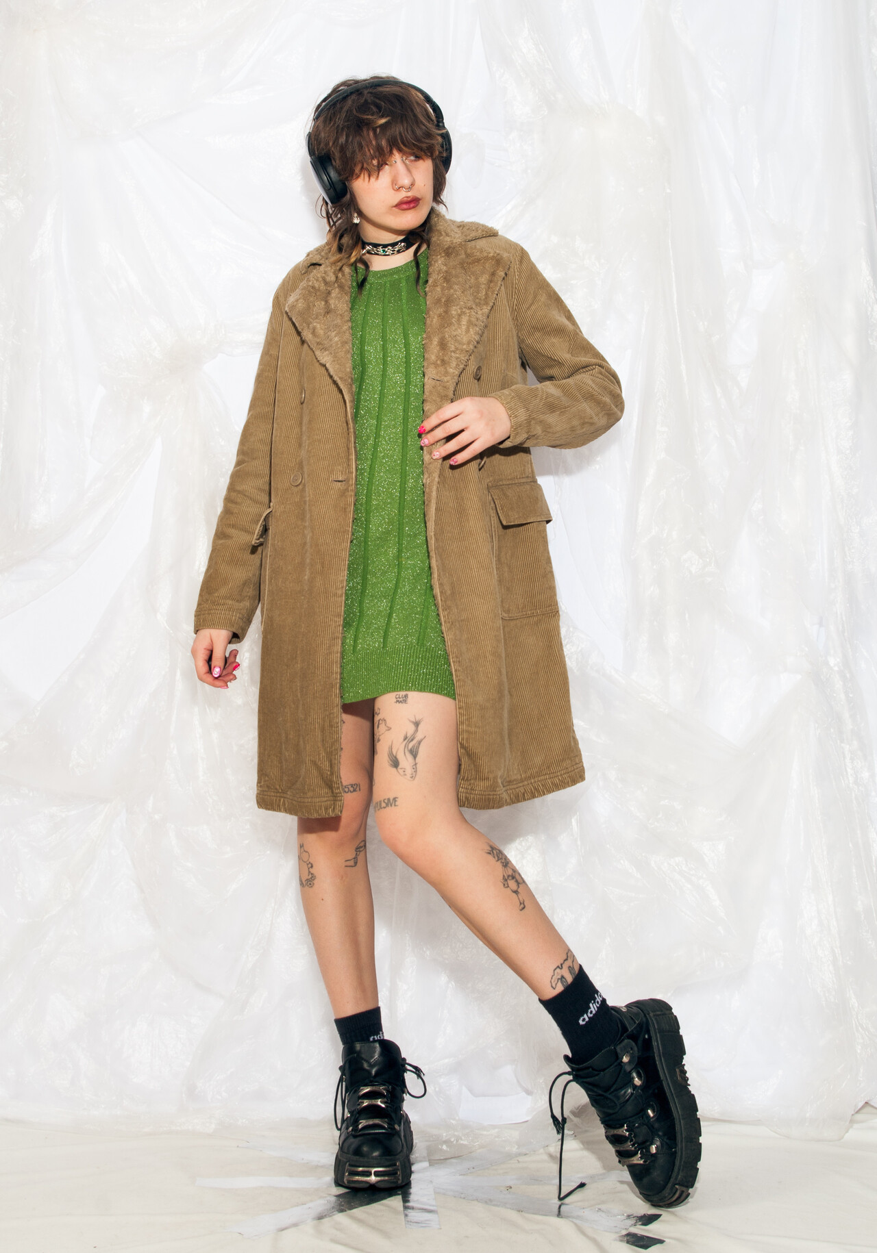 This Y2K vintage coat is the answer to all your throwback dreams. With its faux fur collar and corduroy fabric, you’ll be channelling fairycore grunge vibes in a beige trench style.