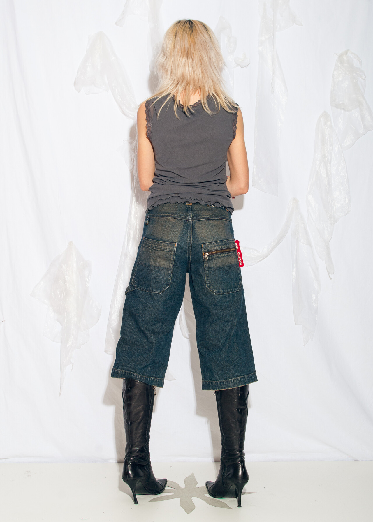Tags: 2000s vintage style, boyfriend shorts, denim jorts, low rise pants, mud wash denim, wide leg capri jeans, y2k grunge clothing