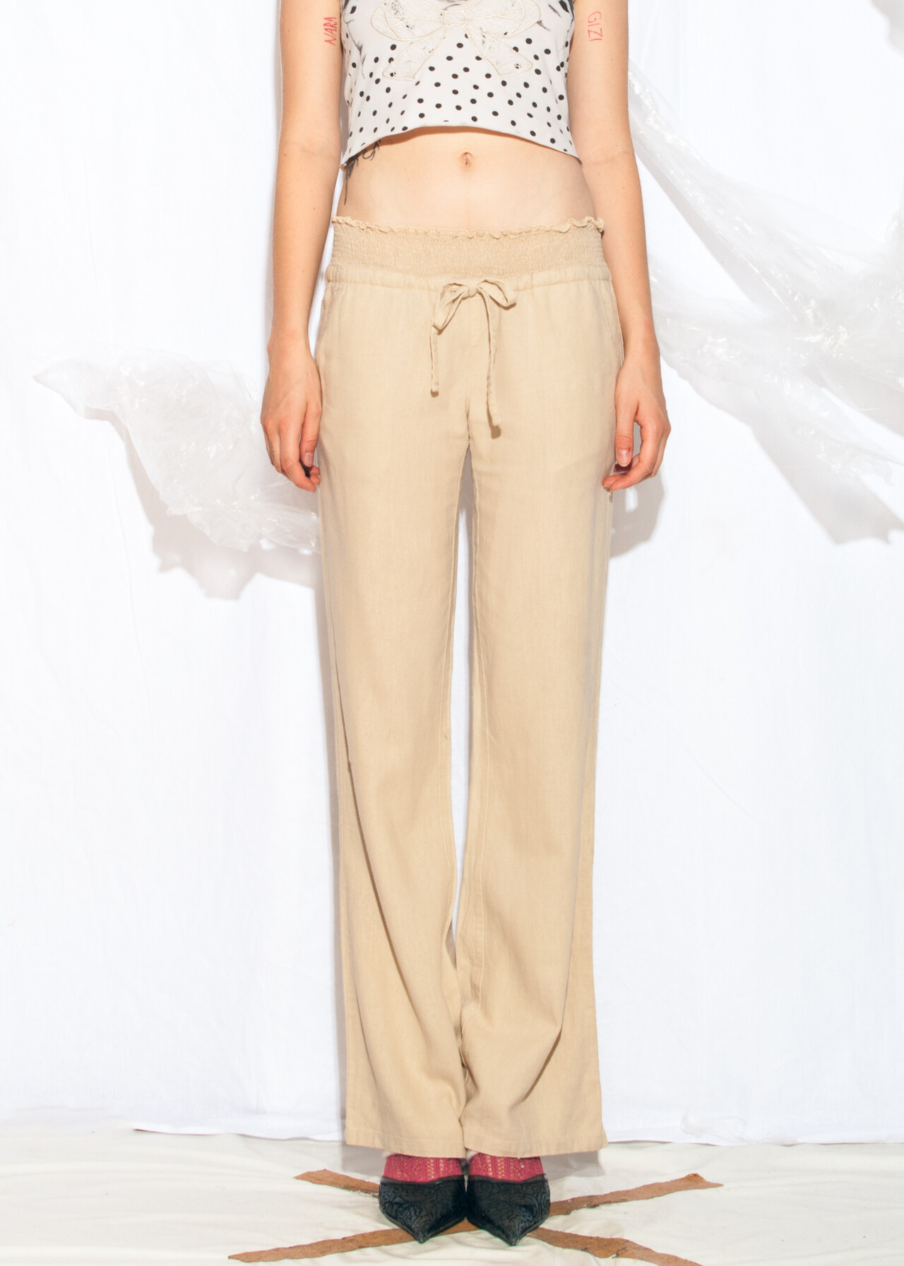 Tags: 2000s vintage style, flare trousers, linen wide leg pants, low rise waist, summer pants