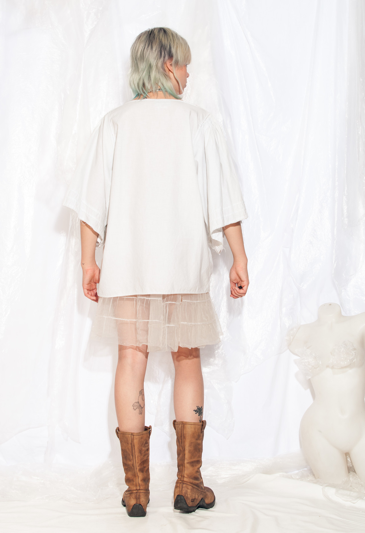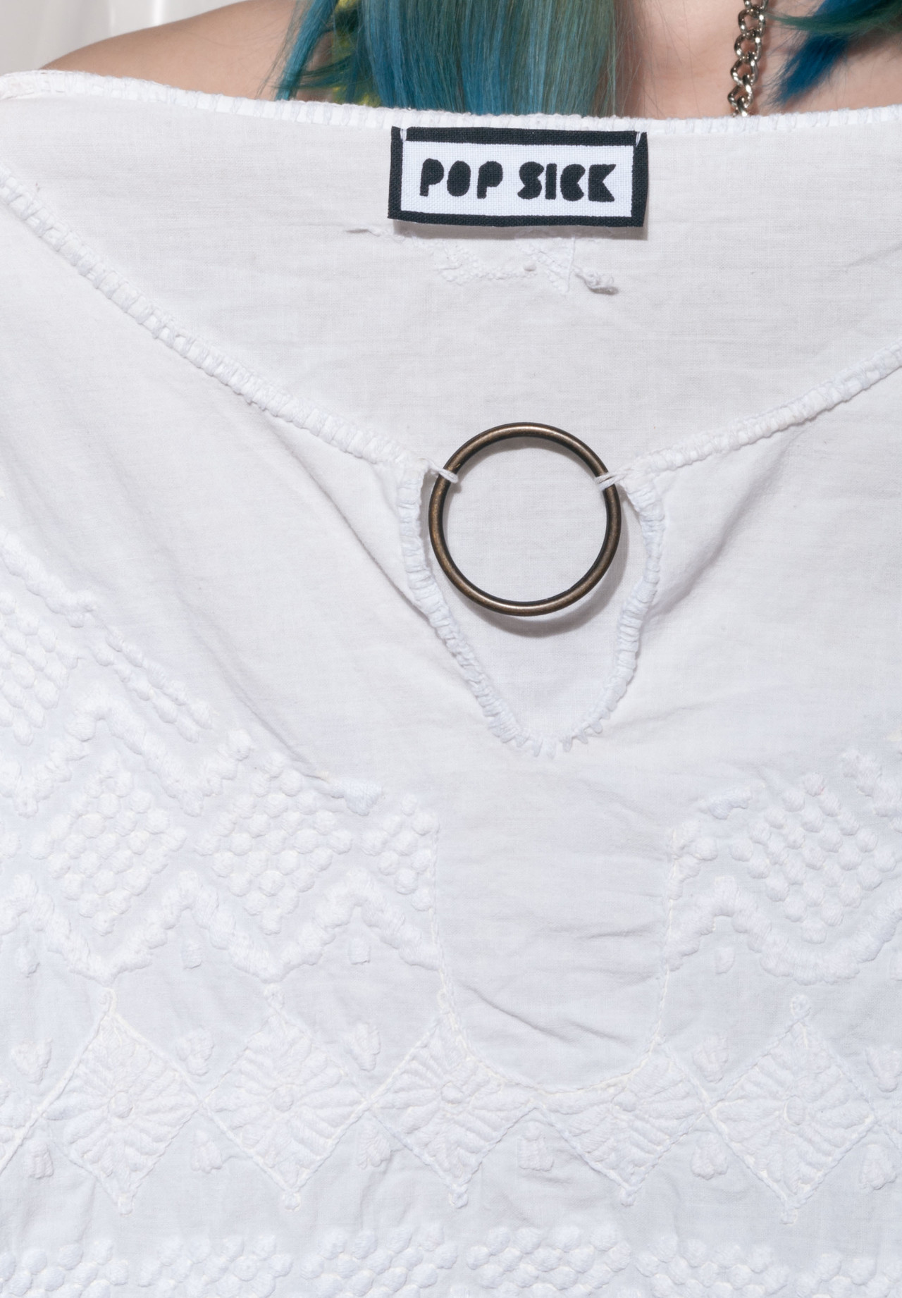 This vintage peasant blouse is a rare antique item from the 30s and it’s still in excellent condition. Featuring white cotton fabric and hand-embroidered pattern. Our in-house rework team cropped its sleeves and added a bronze O-ring to get this one-off look.